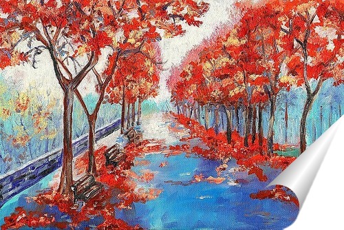 Описание плаката Поздняя осень. Еще несколько дней и деревья останутся голыми. Но пока яркая рыжая листва добавляет солнца в унылую дождливую погоду и отгоняет осеннюю грусть.