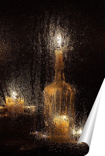 Описание плаката Очередное моё упражнение в съёмке натюрморта за мокрым стеклом. Свечи очень хорошо смотрятся сквозь пелену дождя и потоки воды. Едва различимые силуэты бутылок придают картине загадочность и недосказанность.
