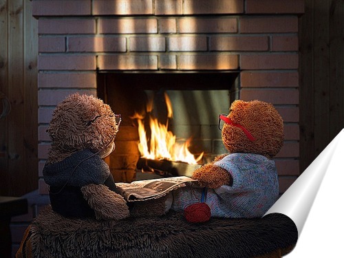 Описание плаката Два игрушечных медвежонка, совсем как люди. Смотрят на огонь в камине. Он с газетой, она с вязанием. Хороший семейный вечер для двоих