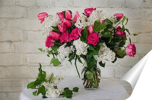 Описание плаката Весенний букет из цветов белой сирени, роз и тюльпанов . Такой постер может украсить любое помещение в вашем доме,квартире, офисе, отеле и наполнит их особым настроением весны.
