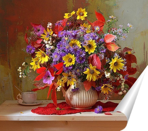 Описание плаката Осенние цветы (астры-сентябринки, топинамбур, петуния), листья девичьего винограда, веточки снежноягодника в одном букете. Кувшин, чашка с кофе. Вязаная крючком красная салфетка.