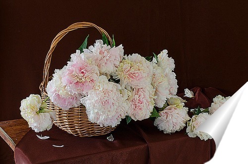 Описание плаката Натюрморт с весенними цветами - розовыми пионами в корзине. Такой постер может украсить любое помещение в вашем доме или квартире, а также в отеле, загородном доме.