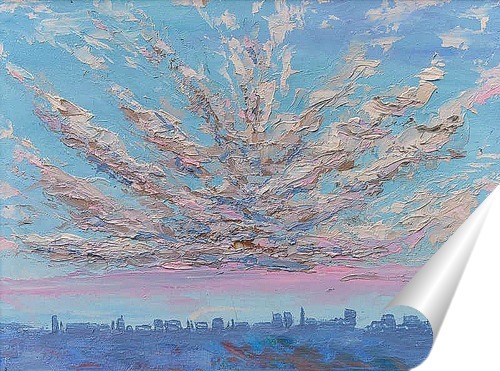 Описание плаката Картина написана в г.Волжском, Волгоградской области. Этот город-герой(Сталинград) Вы и видите . Только не очень ясные очертания. И сверху накрывает город облако. Очень часто в этих местах бывает такое необычное небо.