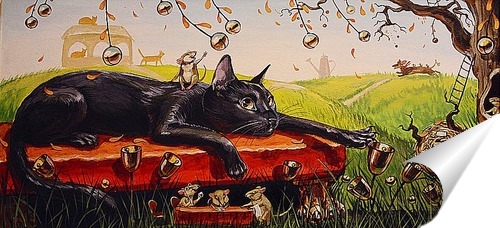 Описание плаката Умиротворяющий сюжет, где черный кот философ блаженствует под сенью звенящего дерева в компании мышат. На дальнем плане узнается еще один персонаж с другой картины автора - Маршрутный такс. Картина превосходно впишется как в интерьер детской комнаты