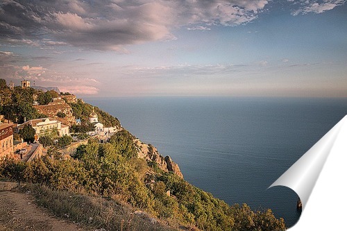 Описание плаката Живописный морской пейзаж на закате у мыса Фиолент с видом на Свято-Георгиевский монастырь. Такой постер может украсить любое помещение вашего дома, офиса, отеля, турфирмы.
