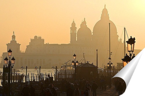 Описание плаката Ноябрь месяц, теплый вечер в Венеции на площади Сан-Марко. Приятно прогуляться по вечернему городу. В закатном солнце тихо покачиваются гондолы, в дымке видны очертания соборов