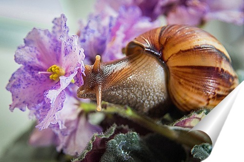 Описание плаката Улитка ползает по цветущим фиалкам, такое впечатление, что улитка нюхает фиалку или наслаждается запахом цветка