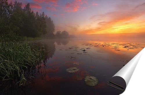 Описание плаката Московская область, город Дубна, река Дубна, Ратмино. Рассвет, лето 2017.