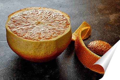 Описание плаката Макро фотография среза апельсина с кожурой в ярком солнечном свете.Кадр выполнен в минималистичном стиле.