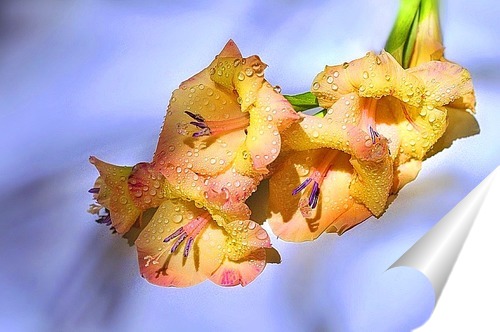 Описание плаката Красивый желтый гладиолус в капельках воды в луче света - выглядит как драгоценность, ощущение свежести, чистоты и красоты...