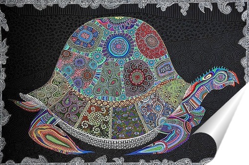 Описание плаката Описание.Графическая kартина ,,Галапагосская черепаха,, выполнена на бумаге водными красками(смешенная техника). Декоративная Картина проработана мелкими орнаментоми и яркими цветами. Это картина лучшее украшение вашего интерьера ( Она подайдет в гос