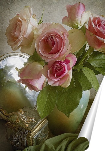 Описание плаката Маленький букет роз, зеркало и старая бабушкина шкатулка с украшениями составляют эту теплую, пронизанную романтикой и легкой грустью, композицию.