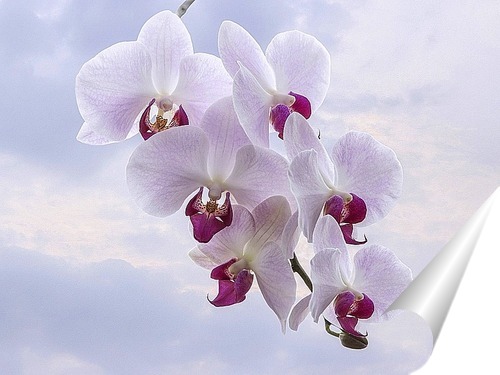 Описание плаката постер с веткой цветущей орхидеи на фоне неба придаст воздушности, объема и свежести любому помещению