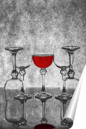 Описание плаката Натюрморт с бокалами и вином - это классический фотоэтюд со стеклянными бокалами. Простая композиция, где главную роль играет свет, цвет, формы и пространственное расположение объектов съёмки