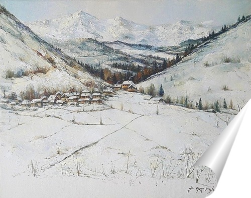 Описание плаката Живописное полотно "Лиахвское ущелье" (оригинал - холст / масло, 40х50 см., 2018 г.) представляет собой изображение заснеженной горной деревеньки.