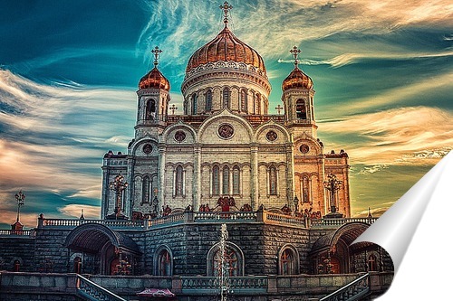 Описание плаката Кафедральный соборный храм Христа Спасителя в Москве — кафедральный собор Русской православной церкви (улица Волхонка, 15—17). Существующее сооружение, построенное в 1990-х годах, является воссозданием одноимённого храма, созданного в XIX веке. Храм