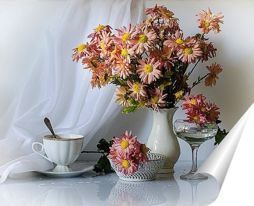 Описание плаката Натюрморт в классическом стиле в светлых тонах с яркими хризантемами и посудой. Такой постер может украсить любое помещение вашего дома, квартиры, отеля .