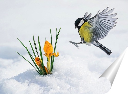 Описание плаката птица синица порхает в весеннем парке над желтым подснежником, пробивающимся из под снега