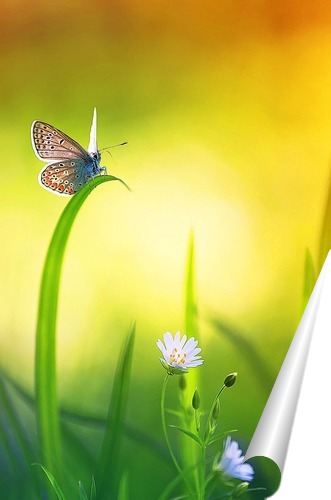 Описание плаката весенняя открытка с маленькой голубой бабочка сидит на лесной поляне среди нежных белых цветов и зеленой травы