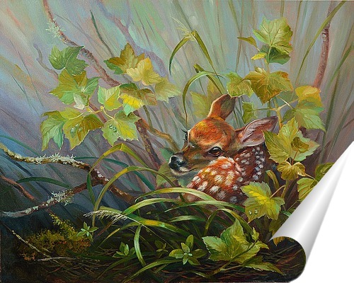 Описание плаката Сразу после рождения оленёнок, как правило, умеет стоять на ногах. Однако ноги трясутся и подкашиваются, поэтому олениха оставляет оленёнка в укромном месте, а сама находится поблизости, чтобы в случае опасности успеть отвлечь хищника и отвести его п
