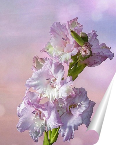 Описание плаката постер нежным розово-сиреневым гладиолусом придаст очарования интерьеру и будет напоминать о лете