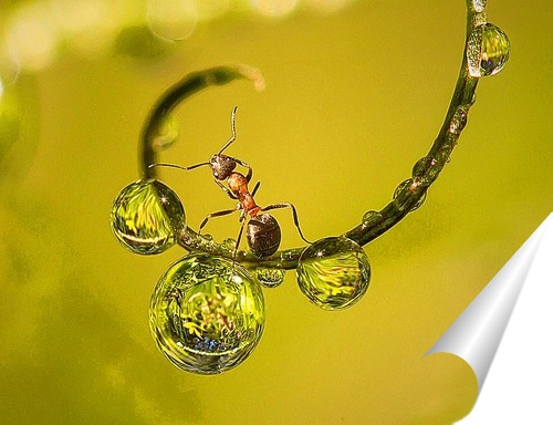 Плакат "Муравей на веточке с каплями росы"