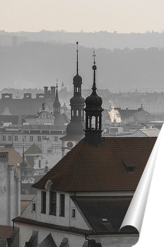 Описание плаката Прага. Поздняя осень, теплый погожий вечер. Солнце клонится к закату. Старый город весь как на ладони с высоты птичьего полета. Лучами предзакатного солнца освещаются, крыши, дома, улочки, башенки.