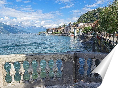 Описание плаката Озеро Комо является третьим по величине озером в Италии и одним из самых глубоких - до 410 м. Состоит из трех рукавов длиной от 26 километров. Общая длина озера - 47 километров. На берегах озера располагаются разноцветные городки - Белладжио, Варенна