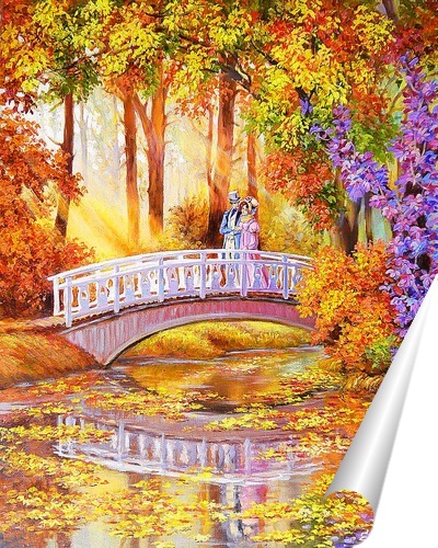 Описание плаката Изысканная светская пара 19века на прогулке по осеннему парку. Навстречу солнечному свету, льющемуся сквозь ветви деревьев, по ажурному белому мосту, словно в сказочно чудесном только их красочном мире, идут навстречу своей благосклонной судьбе...а п