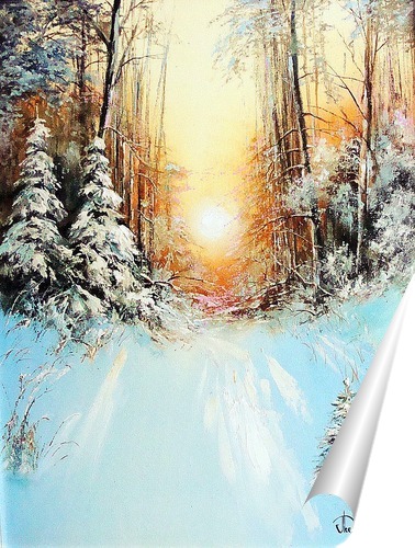 Описание плаката постер, картина для интерьера, сосна, небо, зима, снег, ели, импрессионизм, пейзаж, дорога, тропинка, береза, аллея, лес, солнце