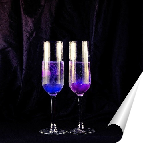 Описание плаката два бокала с прозрачной водой, акварельными красками и каплями на темном фоне, искусственный свет.