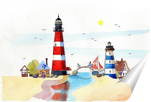 Описание плаката Два маяка на берегу моря. Летнее раннее утро. Штиль. Бриз. Акварель (2017).