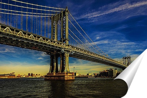 Описание плаката Манхэттенский мост расположен между Бруклинским и Вильямсбургским мостами. Строительство моста началось в 1901 году и 31 декабря 1909 года мост был открыт для движения. Спроектирован Манхэттенский мост Леоном Мойсейфом.Длина моста составляет 2089 мет