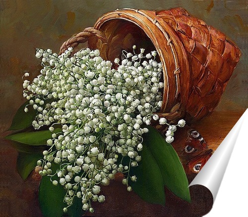 Описание плаката Композиция деревенского натюрморта с ландышами составлена из минимального количества предметов сельского быта. Верхний рассеянный свет попадая на предметы, создает глубину пространства.