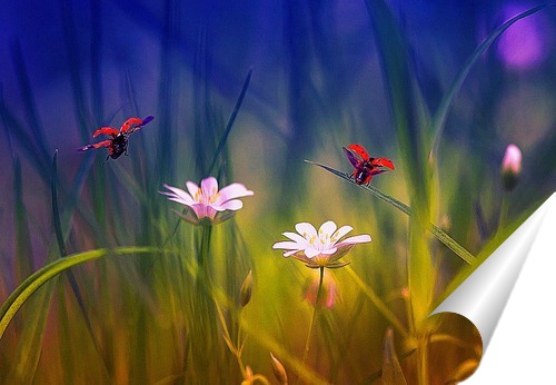 Описание плаката пара божьих коровок летает вечером над белыми маленькими цветами на лесной поляне