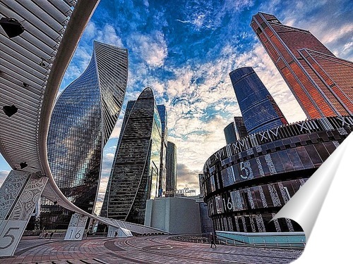 Описание плаката Чувственный закат над Сити, Современная композиция сочетает небоскребы и лазурное небо и отлично контрастирует с футуристическим формами строений Москва Сити. Необычный ракурс создает отличное романтическое настроение. Впервые применены самые последн