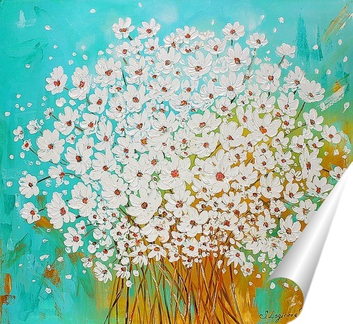 Описание плаката Белые цветы написаны мастихином толстеньким слоем масла. Эффектная картина с большим букетов цветов на холсте.. размер оригинала 85*85. Картина в спальню, картина на кухню, картина над диваном, картина в гостиную- очень эффектно!