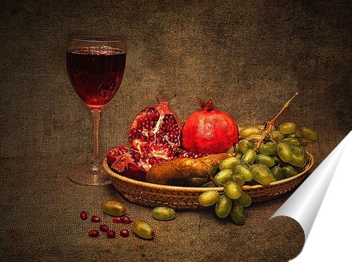 Описание плаката Ещё немного фантазии и снова получился вот такой натюрморт со спелыми ягодами граната, винограда и бокалом красного вина.