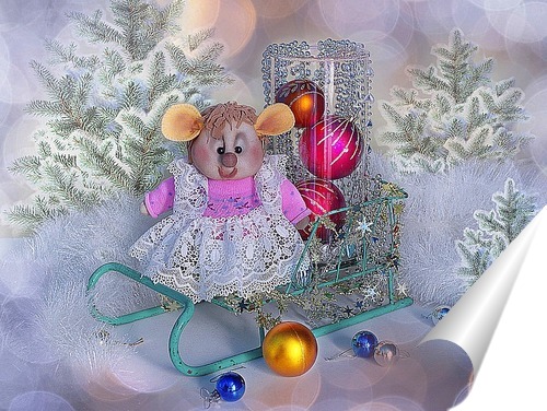 Плакат "Новогодняя композиция с крыской Лариской и елочками игрушками на фоне заснеженного леса"