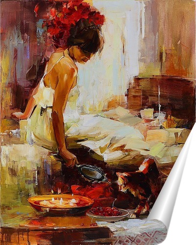 Картина сначала типографским способом переносится на холст, получается "тусклый" отпечаток низкого разрешения , затем художник расписывает ее маслом. Роспись выполняется поверх контура изображения на хлопковом холсте. Холст заполняется маслом не менее чем на 80% поверхности , при этом техника Автора может не выдерживаться, допустимы отклонения в оттенках. Срок изготовления 6-7 рабочих дней . Роспись художником это наиболее оптимальное соотношение цена/качество.