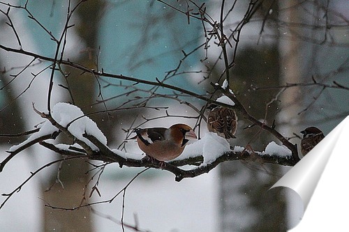 Описание плаката лесной обычный серый клёст в компании воробьев сел отдохнуть на ветку берёзы в снежный зимний день
