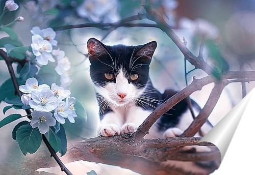 Описание плаката милый котенок сидит на дереве яблоне с белыми цветами в майском солнечном саду