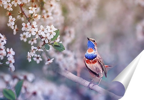 Описание плаката красивый самец птицы варакушки сидит в майском солнечном саду среди веток белой вишни