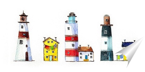 Описание плаката Серия океанских маяков, собранных в один вымышленный городок, где каждый дом это маяк. Написано акварелью 2019 год