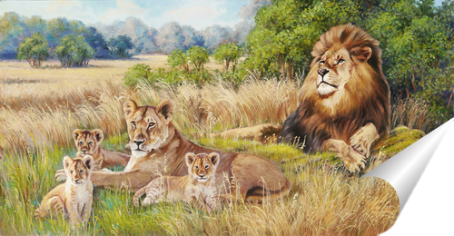 Описание плаката Пейзаж саванны в соломенных оттенках, с семейством роскошных больших кошек на отдыхе. Львиный прайд во всем своем великолепии. И это единственный пример иерархического социального отношения между родственниками в животном мире. Только львы смогли соз