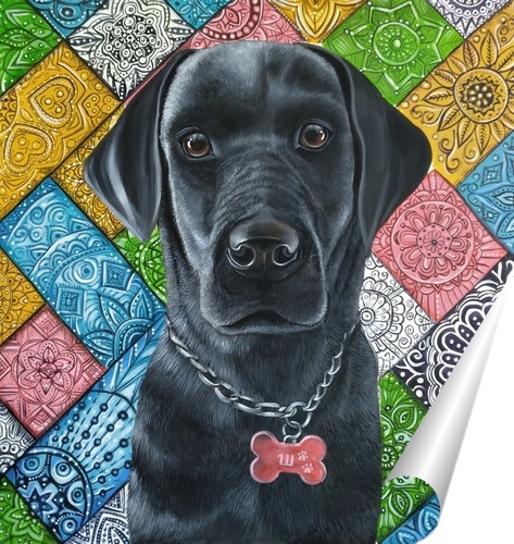 Описание плаката Черный лабрадор Шарлотта на ярком фоне в силе пэчворк. Картина написана акрилом на холсте.