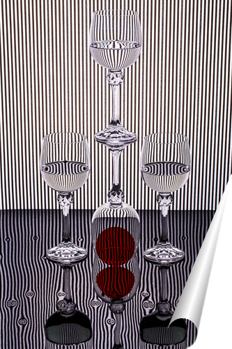 Описание плаката Полосатый натюрморт - это классический фотоэтюд со стеклянными бокалами. Простая композиция, где главную роль играет фон, свет, цвет, формы и пространственное расположение объектов съёмки