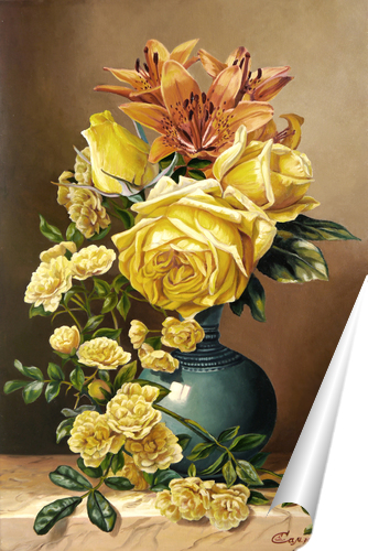 Описание плаката Классический натюрморт в духе английских мастеров 19 века. Станет прекрасным украшением дома любителя букетов желтых роз, написанных в изящной технике масляной живописи.