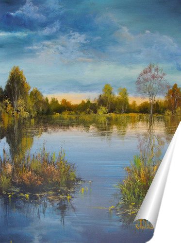 Описание плаката весна,пейзаж,постер,картина,пруд,Москва,купить картину,солнце,весенний пейзаж,лес,пруд,озеро,берег,камыши