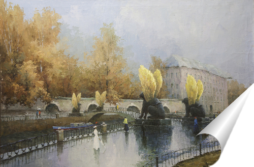 Описание плаката Красивый,атмосферный пейзаж с изображением Банковского моста в Санкт-Петербурге.